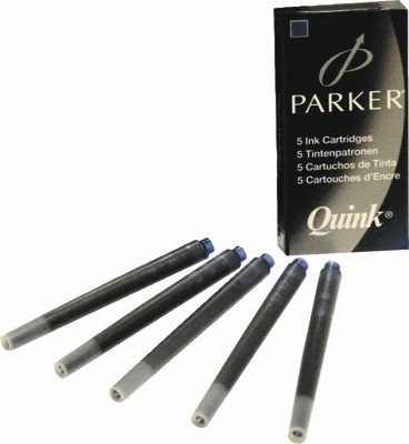 Naboje do wszystkich piór wiecznych Parkera z dużym zasobnikiem i zbiorniczkiem zapasowym informującym o kończącym się atramencie.