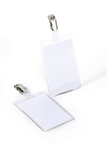 Do dowodów lub kart identyfikacyjnyche. Z mocno Przezroczystej twardej folii. Z obrotowym klipsem umożliwiającym pionowe zaczepienie. Kieszeń otwarta od góry umożliwia szybkie wyciąganie dowodu bez odpinania klipsa. Z etykietami do zadrukowania. Pionowy: 90 x 60 mm