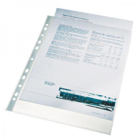 Wykonane z folii PP. Specjalnie wyprofilowana powierzchnia zapobiega odbijaniu się światła. Europerforacja jest dodatkowo wzmacniana. Krystaliczne, 105mic., otwór u góry, format A4, pakowane po 100 sztuk w kartonie