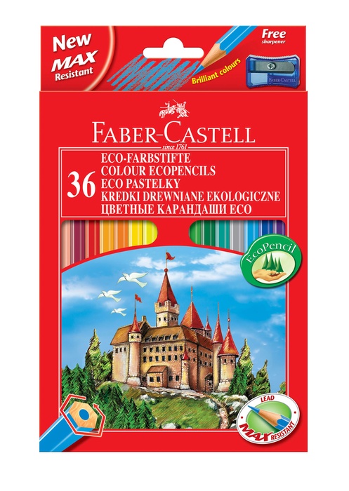 Kredki ołówkowe Zamek Faber-Castell 36 szt. w opakowaniu kartonowym. Klasycznie doskonałe, idealne do każdego stylu rysowania, zarówno dla dzieci jak i hobbystów. Odpowiednie do drobnych detali oraz kolorowania. To wysokiej jakości produkt, który dostarcza wiele przyjemności i radości z rysowania. Wyraźne i nasycone kolory, optymalnie miękkie i gładkie w aplikacji. Łatwe do temperowania. Klasyczny sześciokątny kształt zapewnia wygodę używania. Grafit kredek jest wysoko odporny na pękanie, dzięki bezpiecznemu procesowi wiązania (SV). Wykonane z certyfikowanego drewna pochodzącego ze zrównoważonego i odpowiedzialnie zarządzanego leśnictwa. Emisja CO2 spowodowana procesem produkcyjnym tych produktów jest neutralizowana przez certyfikowane projekty. Dostępne w różnych kolorach i różnych zestawach.