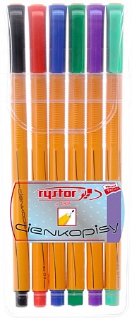 Niezawodny, ekonomiczny w użyciu cienkopis z fibrową końcówką piszącą oprawioną w metal o grubości 0,4 mm; tusz na bazie wody; wentylowana skuwka. Zestaw 6 kolorów.