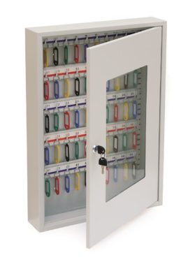 Metalowa szafka na 50 kluczy. Kolor szary. Zamek na klucz. W komplecie - zawieszki.