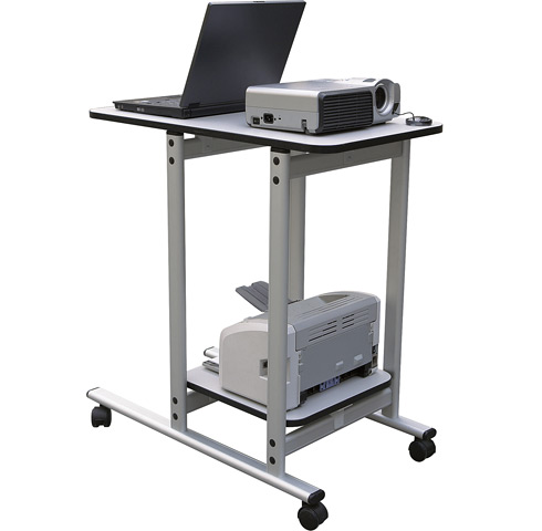 Profesjonalny, wielofunkcyjny stolik projekcyjny, posiadający dwie półki z przeznaczeniem na projektor, rzutnik, notebooka, czy drukarkę. Blat wykonano z płyty meblowej w kolorze popielatym. Aluminiowa podstawa jezdna w kolorze srebrnym, wyposażona dodatkowo w kółka z systemem blokującym, zapewniając mobilność stolika.
