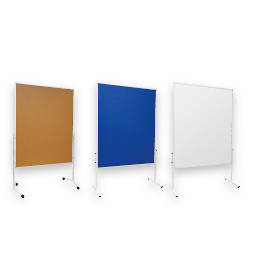 Rama z profilu aluminiowego w kolorze białym, nogi stalowe. Tablica o podstawie typu V posiada nogi wyposażone w kółka. Powierzchnia: suchościeralna lakierowana, korkowa lub tekstylna (w kolorze niebieskim lub szarym).
