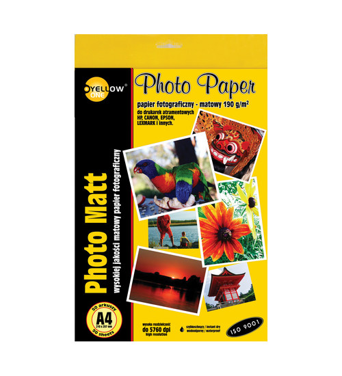 Papier fotograficzny Yellow One matowy, przeznaczony do drukarek atramentowych. Specjalna powłoka o brylantowej bieli zapewnia idealne wydruki fotograficzne w naturalnych kolorach. Wodoodporny i szybkoschnący. Wysoka rozdzielczość: do 5760 dpi. Certyfikat ISO 9001. 50 arkuszy w opakowaniu. Format A4, gramatura 190g/m2. Jednostka sprzedaży: 1 opak.