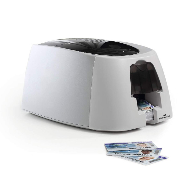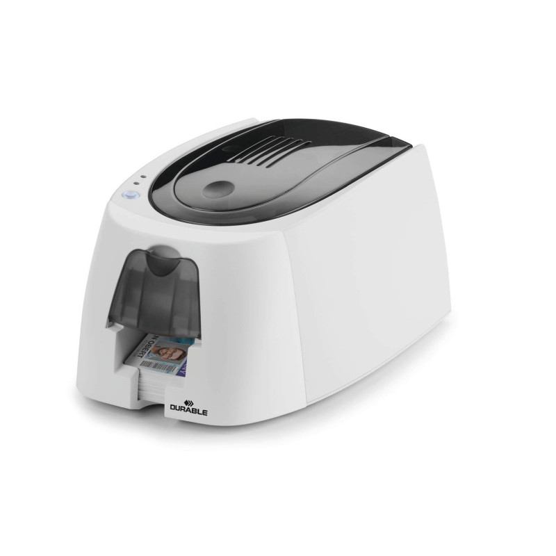 Drukarka do szybkiego zadrukowania kart plastikowych łącznie z kolorową taśmą barwiącą YMCKO i 100 pustymi kartami. Wydruk jest wodoodporny, od brzegu do brzegu zarówno w kolorze jak i w kolorze czarnym. Z podajnikiem z wygodnym dostępem i zbiorniczkiem na 25 grubszych lub 40 standardowych zadrukowanych kart. Idealnie nadaje się na wydruk e-legitymacji. Bezpłatny program online ze wzorami kart do łatwego zaprojektowania na www.webapp.duraprint.de. Zadrukowane karty można wykorzystywać w połączeniu z szeroką ofertą etui do kart identyfikacyjnych DURABLE.