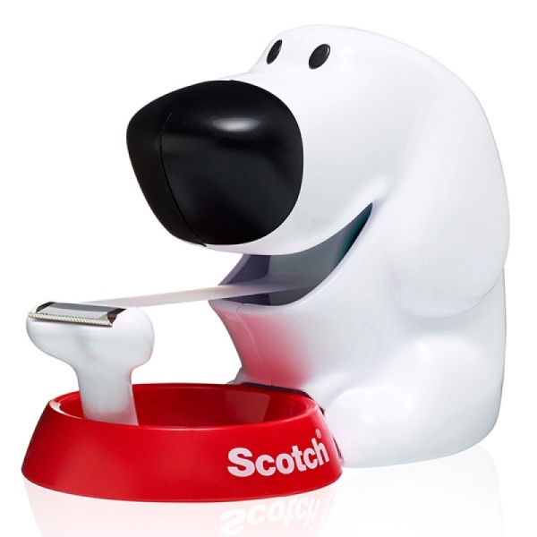 Dyspenser w kształcie pieska, przeznaczony do taśm o maksymalnej szerokości 19mm. Łatwy i bezpieczny proces wymiany rolki. Gilotynka ułatwia równe odrywanie fragmentów taśmy. Taśma Scotch Magic 19mm x 8,89m w zestawie.