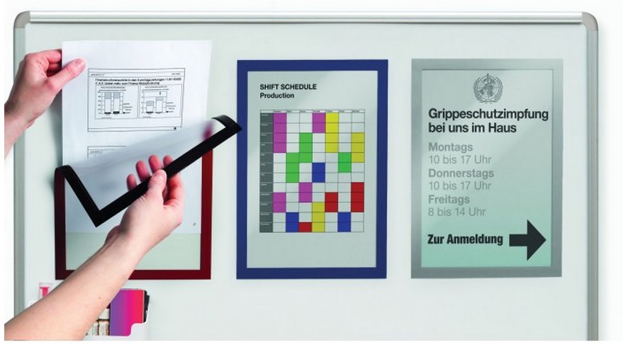Kolorowa ramka informacyjna z magnetycznymi paskami mocującymi na informacje w rozmiarze A4. Do zastosowania w pionie i poziomie. Prosta i szybka wymiana dokumentów przez odchylenie koszulki. Transparentna, twarda folia chroni dokumenty. Magnes może być przymocowany do metalowych powierzchni.