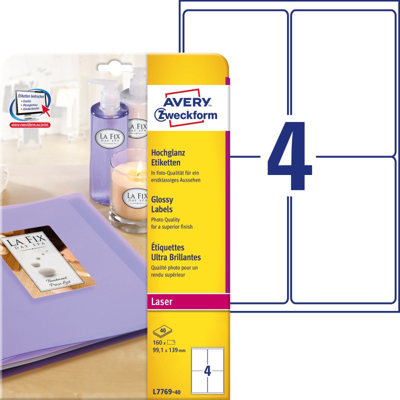 Etykieta Avery 99,x139 (A4/40ark) biała L7769-40 błyszczące;