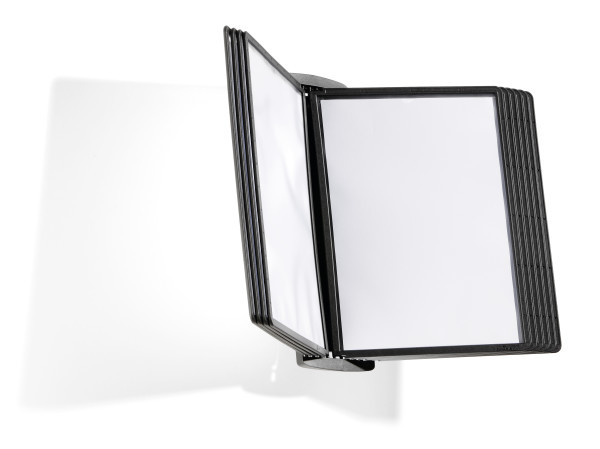 Zestaw paneli na ścianę w formacie A4 do obustronnego wykorzystania do wszelkich informacji: cenników, stron katalogowych, zdjęć itd. (pakowany po 10 szt., w kolorze czarnym). Antyrefleksyjne ramki, z przezroczystą folią, umożliwiającą skanowanie informacji.