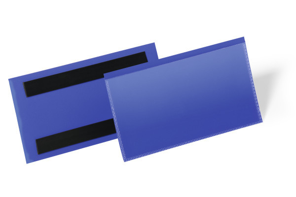 Kieszeń z dwoma paskami magnetycznymi na tylnej ściance. Zastosowanie na metalowych powierzchniach, takich regały magazynowe, perforowane metalowe ścianki i metalowe pojemniki. Niebieska folia tylnej ścianki i przezroczyste okienko wykonane zostały z mocnego i trwałego polipropylenu. Odpowiednie dla skanerów i odporne na rozdarcia. Szybka wymiana zadrukowanych etykiet. Szablony do etykiet do pobrania na www.duraprint.pl
