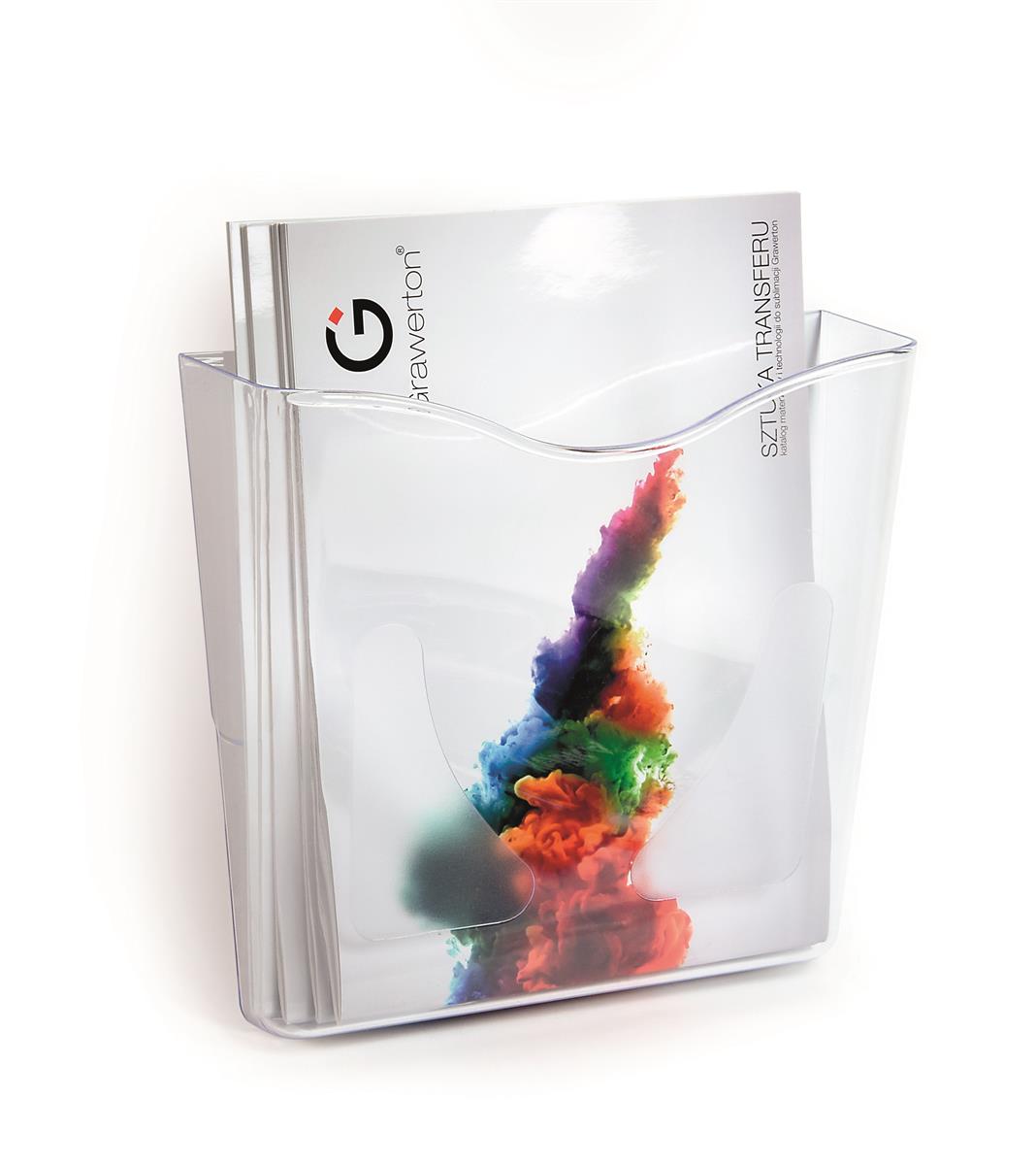 - prezenter na ulotki i foldery formatu A4- montowany do ściany- sztywne przezroczyste tworzywo PS- zwężany ku dołowi- wymiary: 255 x 250 góra/240 dół x 9,8 mm- opakowanie 2 szt.