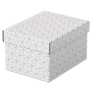 Zestaw trzech nowoczesnych i stylowych tekturowych pudełek ze zdejmowaną pokrywą, idealnych do zapakowania prezentów lub szybkiego wykreowania w domu nowego miejsca do przechowywania. Można je używać oddzielnie lub ustawiać na półkach i regałach, aby mniejsze rzeczy, takie jak zdjęcia czy dokumenty osobiste były przechowywane w uporządkowany i łatwy do znalezienia sposób. Dodaj wstążkę i zapakuj prezent! Po wyjęciu prezentu obdarowany może wykorzystać pudełko do przechowywania różnych rzeczy, dzięki czemu otrzyma 2 prezenty w jednym. Wykonane z mocnej tektury falistej, w 100% pochodzącej z recyklingu i w 100% nadającej się do ponownego przetworzenia, opatrzonej certyfikatem FSC. Mają gładką, łatwą do czyszczenia powierzchnię z dwukolorowym, geometrycznym wzorem, dopełniającym styl wnętrza. Pudełka są dostarczane na płasko, do samodzielnego złożenia, a ich montaż jest szybki i łatwy. Po złożeniu boki pudełka tworzą podwójne ścianki, dzięki czemu pudełka są mocne i dobrze chronią zawartość. Wszystkie mają ten sam rozmiar.