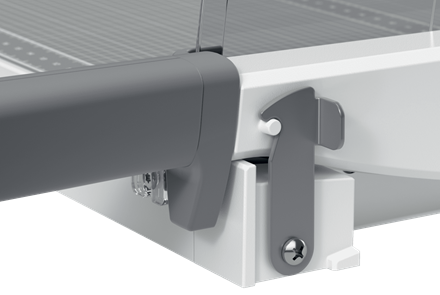 - Osłona zabezpieczająca ostrze zapewnia pełną ochronę podczas użytkowania, a zatrzask bezpieczeństwa blokuje ostrze, gdy gilotyna nie jest używana