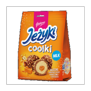 Praliny Jeżyki Coolki to zupełnie nowa odsłona ulubionych ciastek w czekoladzie. Zachwyca kruchym wafelkiem, ciasteczkowym aksamitnym kremem i wyrazistą mleczną czekoladą. Serce pralinki stanowi kropelka płynnego karmelu, a całość posypana jest chrupiącą posypką z karmelizowanymi orzeszkami. Jeżyki Coolki to uczta dla zmysłów. Po słodką przyjemność można sięgnąć przy każdej, nawet niezobowiązującej okazji? Praliny zostały pojedynczo zapakowane i zamknięte w wygodnej torebce, aby móc się nimi dzielić z bliskimi lub delektować się w pojedynkę.