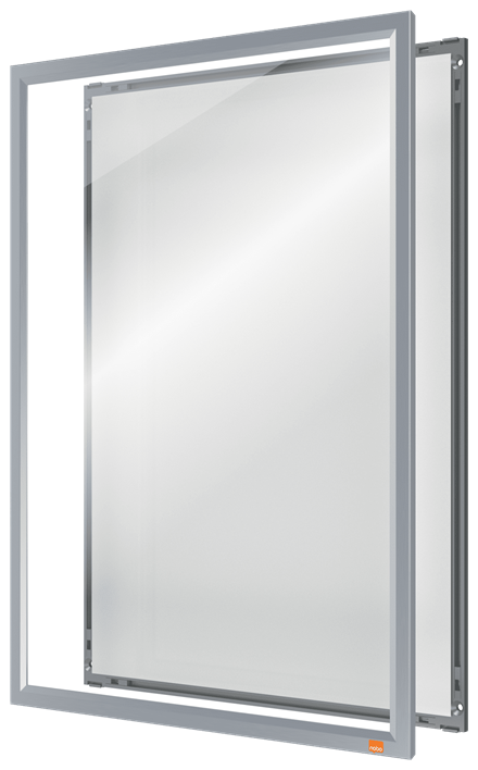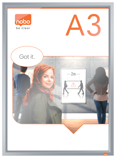Mocowana do ściany, stylowa, niskoprofilowa ramka zatrzaskowa ze ściętymi, bezspoinowymi narożnikami i prawdziwie innowacyjnym mechanizmem do wymiany prezentowanych materiałów. Zdejmij przedni panel ramy, wymień informację umieszczoną za przezroczystą osłoną, przyłóż ponownie przedni panel i dociśnij tak, by usłyszeć kliknięcie zatrzasku. To stabilne i bezpieczne rozwiązanie z tylnym panelem mocno przymocowanym do ściany w narożnikach pozwala na wymianę zawartości bez zdejmowania całej ramki ze ściany. Innowacyjna konstrukcja usprawnia tradycyjny proces wymiany informacji, czyniąc go szybkim i prostym. Do zamieszczania materiałów w formacie A3.