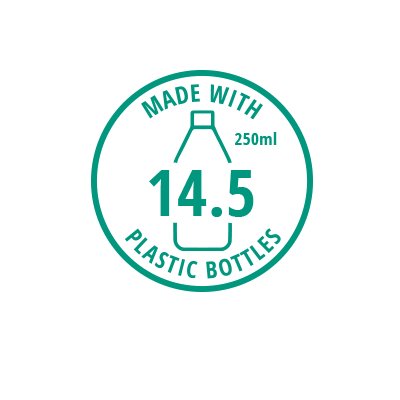 - Wykonany z 14,5 plastikowych butelek o pojemności 250 ml
