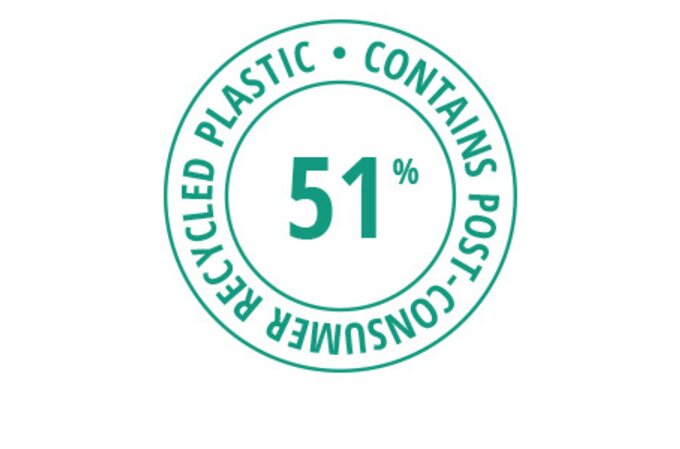 Tworzywo sztuczne użyte w tym produkcie w 51% pochodzi z recyklingu poużytkowego (PCR). *Nie obejmuje zestawu płytki drukowanej, akumulatora ani kabla do ładowania