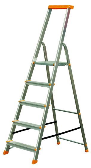 Drabina aluminiowa. Odpowiada normie europejskiej EN 131. Drabina wyposażona w plastikową półkę. Maksymalny udźwig - 150 kg. 4 stopnie + podest.