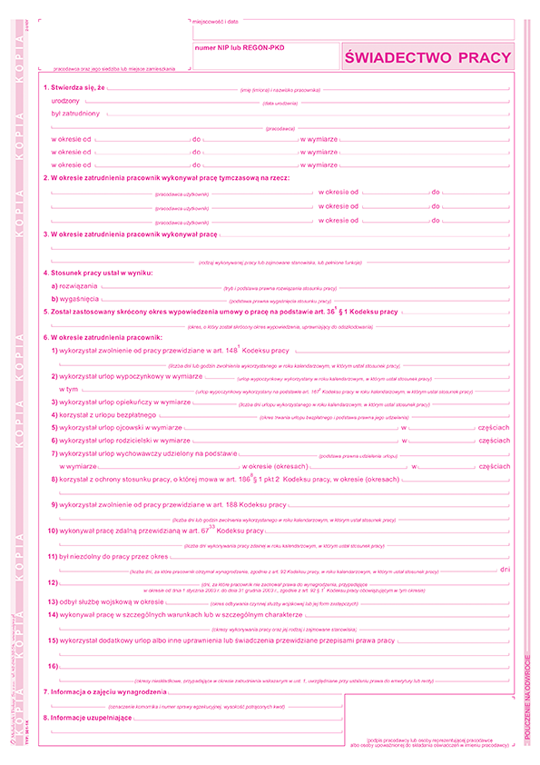 Nazwa: Świadectwo pracy.Symbol: 501-1KOprawa: bloczek 40 kartek.samokopiadwustronny (oryginał+kopia)