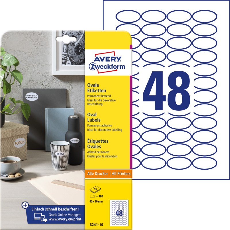 Etykiety owalne Avery Zweckform, A4, 10 ark./op., 40 x 20 mm, białe, trwałe