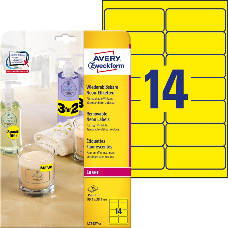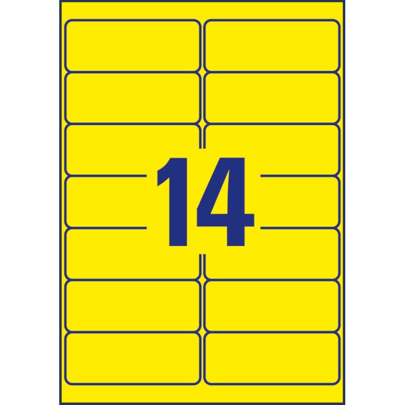 Usuwalne etykiety neonowe Avery Zweckform, A4, 25 ark./op., 99,1 x 38,1 mm, żółte neonowe