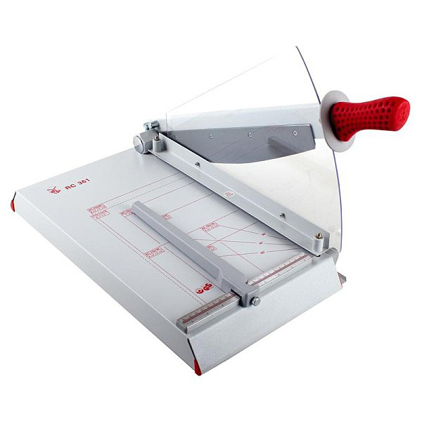 Gilotyna biurowa z ręcznym systemem docisku papieru. Przezroczysta osłona zapewniająca bezpieczeństwo pracy. Ergonomiczny uchwyt przeciwpoślizgowy. Na blatach roboczych standardowe szablony formatów. Precyzyjny ogranicznik do regulowania wymiarów cięcia. Jednorazowe cięcie do 30 kartek 70 g. Długość cięcia: 360 mm. Wymiary blatu: 440x300 mm.