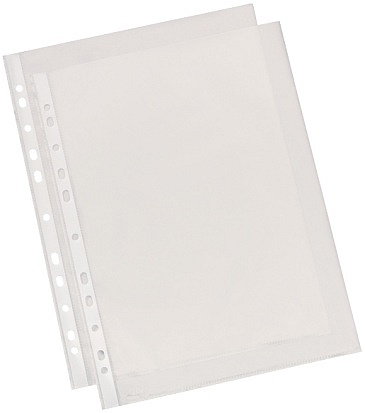 Wykonane z folii PP. Specjalnie wyprofilowana powierzchnia zapobiega odbijaniu się światła. Europerforacja jest dodatkowo wzmacniana. Krystaliczne, otwór u góry, format A4, pakowane po 100 sztuk w kartonie.