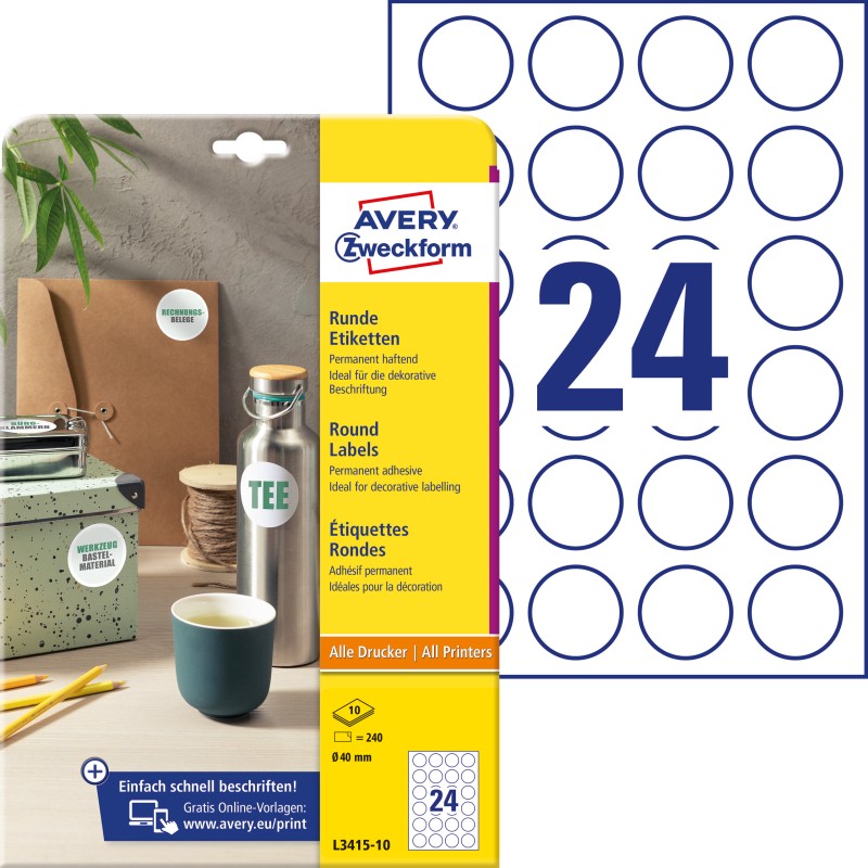 Etykieta Avery ¤ 40 (A4/10ark) L3415-10 okrągła, biała, trwała