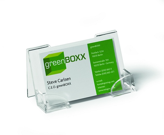 Atrakcyjne wzornictwo i funkcjonalność. Stojak pomieści do 50 wizytówek o szerokośći 100 mm. Stojak z akrylu można używac również i dla pojedynczych wizytówek, dla których oparciem sa specjalne rowki. Dołączone do produktu dwustronne etykietki samoprzylepne umożliwiają umocowanie stojaka na jego tylniej ściance.