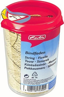 Sznurek o długości 120 m w plastikowym pojemniku z wieczkiem zamykającym, wyposażonym w nóż odcinający oraz spinacz zapobiegający niepożądanemu rozwinięciu się i splątaniu sznurka.