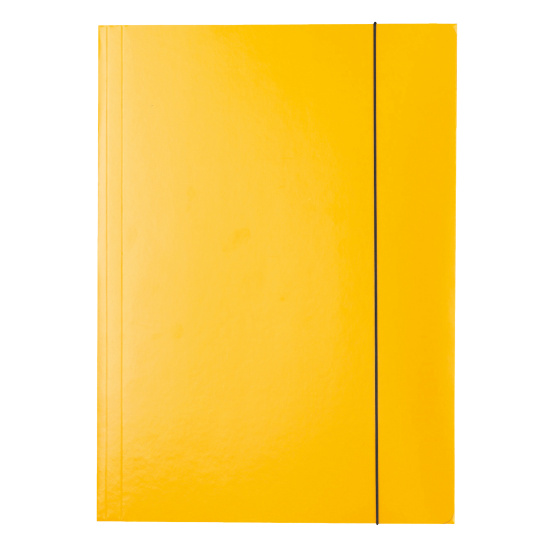 Teczka na dokumenty o formacie A4. Zamykana elastyczną gumką. Wykonana z mocnego kartonu o grubości 400 gsm, barwionego i lakierowanego z zewnętrznej strony. Trzy zakładki chroniące dokumenty przed wypadaniem. Kolor żółty. Jednostka sprzedaży 1 szt.