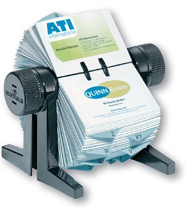 Wizytownik obrotowy na 150 obustronnych wkładów, mieści 300 wizytówek. Przekładki A-Z. Jednostka sprzedaży 1szt.