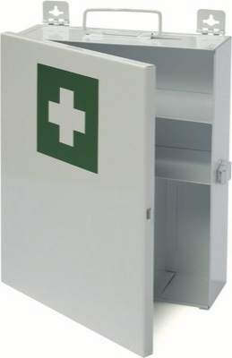 Trzy półki. Wygodny uchwyt do przenoszenia apteczki. Kolor biały, na drzwiczkach biały krzyż na zielonym tle. Wymiary 290 x 230 x 80 mm.