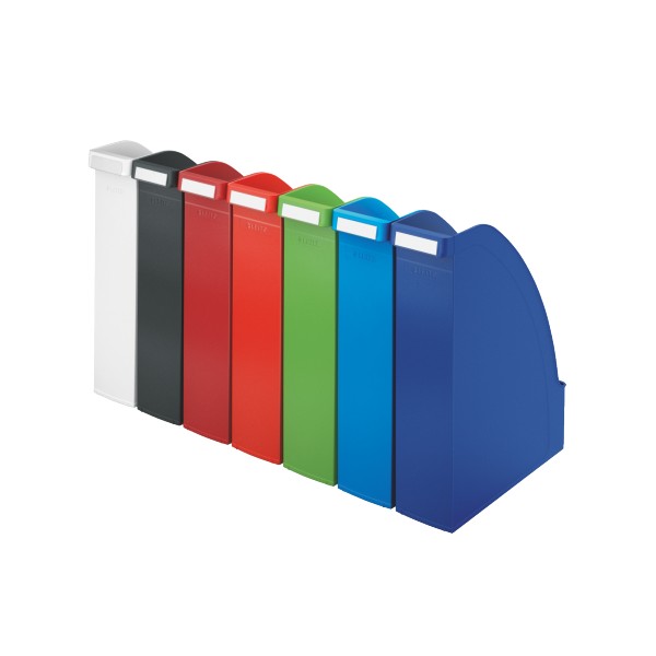 Najwyższej jakości pojemnik na czasopisma. Wzornictwo i kolorystyka spójna z linią produktów na biurko Leitz Plus.