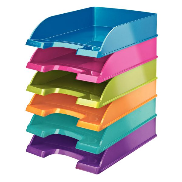 Zwracająca na siebie uwagę półka na dokumenty Leitz Plus w promiennych WOW kolorach. Może być użyta indywidualnie lub łączona w stos.