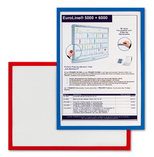 Ramka z folią PCV idealna do prezentacji dokumentów na tablicach magnetycznych. W kolorze niebieskim. Format A4. Szerokość obramowania: 1 cm.