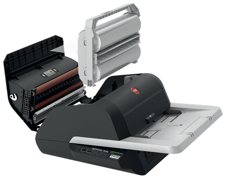 - Kaseta z folią, łatwa do załadowania, pozwoli Ci zalaminować do 250 dokumentów A4 - w ofercie folie o grubości 75 i 125 mikronów.