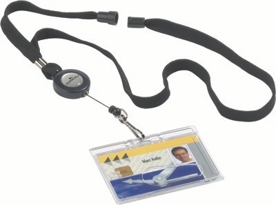 Mechanizm ściągający umożliwiający wyciągnięcie identyfikatora na odległość do 60 cm umieszczony na taśmie tekstylnej o szerokości 10 mm.