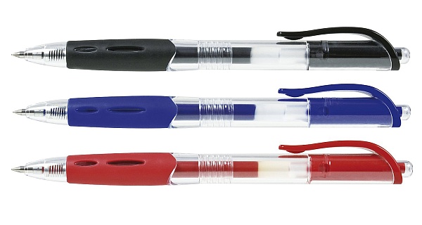 Pióra żelowe w przezroczystej obudowie, automatyczne, z tuszem żelowym wygodny gumowany uchwyt typu Soft, trwały mechanizm włączający, wymienne wkłady, metalowa końcówka z welframową kulką 0,5 mm, widoczny poziom tuszu, atrakcyjne, żywe kolory.