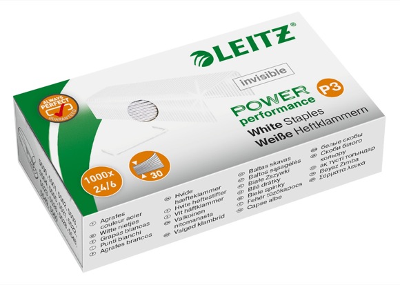 Białe zszywki, niewidoczne na papierze. Rodzaj 24/6, pakowane po 1000 szt. Jednostka sprzedaży: 1 opak. Dostępne od 2013 r.