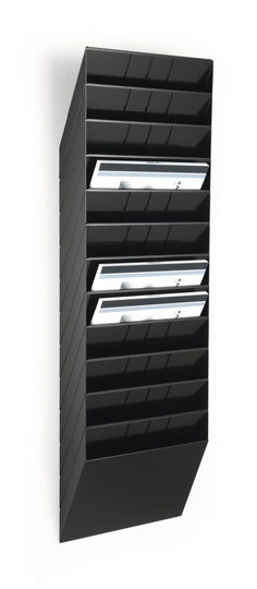 Zestaw 12 pojemników na dokumenty formatu A4 w układzie poziomym. Wymiary: 348 x 620 x 95 mm (SxWxG).