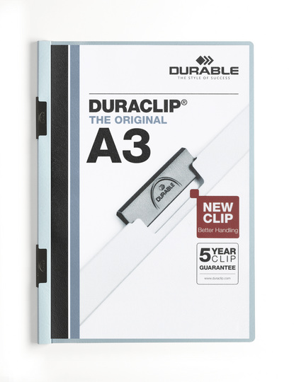 Oryginalny skoroszyt DURACLIP: wynaleziony przez DURABLE, z trwałej folii z długowiecznym zaciskiem z elastycznej stali specjalnej. Przeznaczonay do prezentacji, sortowania i przechowywania ofert, materiałów konferencyjnych i szkoleniowych, sprawozdań i dokumentów. Posiada 5-letnią gwarancję na siłę docisku. Z przezroczystą przednią okładką. Pojemność:1-60 kartek A3.