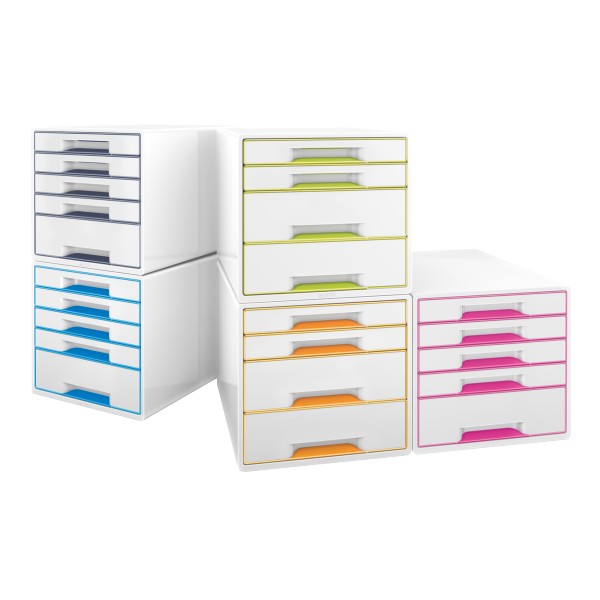 Przykuwające wzrok, najwyższej jakości pojemniki z szufladami WOW z niezwykłym i stylowym połączniem dwóch kolorów o błyszczącym wykończeniu. Wytrzymały pojemnik z szufladami doskonale pasuje do pozostałych produktów z kolekcji Leitz WOW.