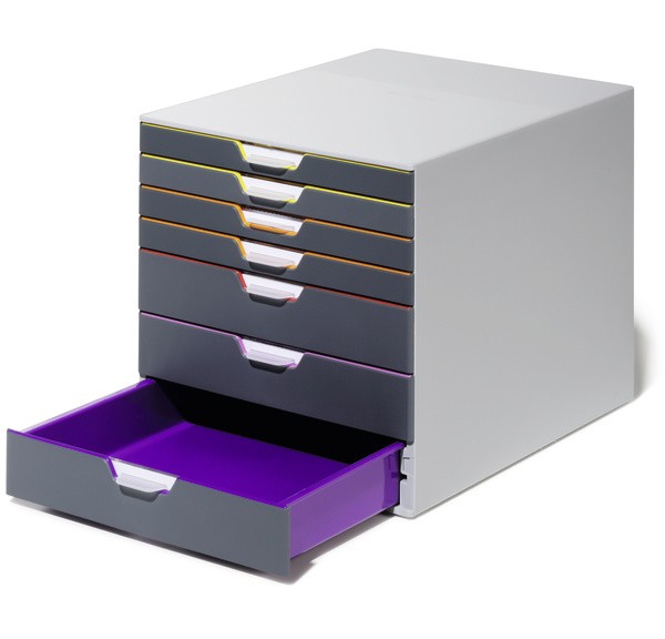Stylowy i innowacyjny pojemnik z 7-cioma kolorowymi szufladami z wysokiej jakości tworzywa sztucznego. Delikatne kolorowe linie na brzegach frontów szuflad są pomocne przy porządkowaniu dokumentów. Cicho i lekko wysuwające się szuflady posiadają blokady. Szuflady przeznaczone na dokumenty do formatu A4, C4 oraz mniejszych rozmiarów jak Folio oraz A5. Na frontach szuflad znajdują się przezroczyste okienka z etykietami, które można opisać także komputerowo. Etykiety wymienia się w prosty sposób. Pojemniki można wykorzystywać we wszystkich standardowych regałach oraz szafach biurowych. Można je także ustawiać jeden na drugim dzięki antypoślizgowym stopkom z tworzywa.