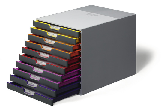 Stylowy i innowacyjny pojemnik z 10-cioma kolorowymi szufladami z wysokiej jakości tworzywa sztucznego. Delikatne kolorowe linie na brzegach frontów szuflad są pomocne przy porządkowaniu dokumentów. Cicho i lekko wysuwające się szuflady posiadają blokady. Szuflady przeznaczone na dokumenty do formatu A4, C4 oraz mniejszych rozmiarów jak Folio oraz A5. Na frontach szuflad znajdują się przezroczyste okienka z etykietami, które można opisać także komputerowo. Etykiety wymienia się w prosty sposób. Pojemniki można wykorzystywać we wszystkich standardowych regałach oraz szafach biurowych. Można je także ustawiać jeden na drugim dzięki antypoślizgowym stopkom z tworzywa. Wymiary: 292 x 280 x 356 mm (szer. x wys. x głęb.)