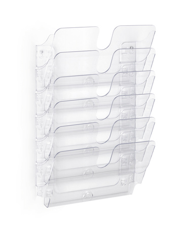 Zestaw 6 pojemników na dokumenty formatu A4 w układzie poziomym. Pojemniki z zestawów Flexiplus można odczepiać od zestawu i pojedynczo wieszać na ścianie.