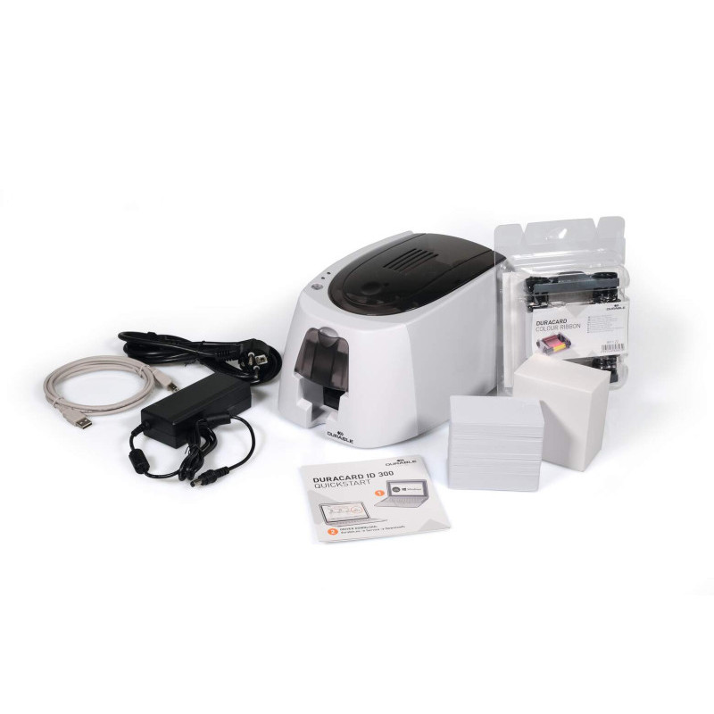 Drukarka do szybkiego zadrukowania kart plastikowych łącznie z kolorową taśmą barwiącą YMCKO i 100 pustymi kartami. Wydruk jest wodoodporny, od brzegu do brzegu zarówno w kolorze jak i w kolorze czarnym. Z podajnikiem z wygodnym dostępem i zbiorniczkiem na 25 grubszych lub 40 standardowych zadrukowanych kart. Idealnie nadaje się na wydruk e-legitymacji. Bezpłatny program online ze wzorami kart do łatwego zaprojektowania na www.webapp.duraprint.de. Zadrukowane karty można wykorzystywać w połączeniu z szeroką ofertą etui do kart identyfikacyjnych DURABLE.