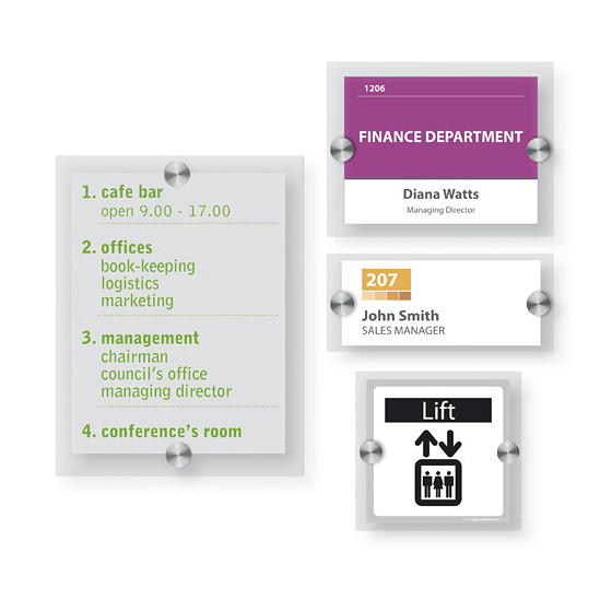 Tabliczka informacyjna przydrzwiowa przeznaczona do użytku wewnętrznego. Składa się z dwóch płyt wykonanych z przeźroczystej pleksi. Na krótszych bokach tabliczki znajdują się dekoracyjne śruby ze stali nierdzewnej, które nadają jej elegancki i nowoczesny wygląd, a tym samym zabezpieczają informację znajdującą się w środku. Łatwa i szybka w montażu. Istnieje możliwość zawieszenia tabliczki zarówno w pionie, jak i w poziomie - w zależności od potrzeb. W komplecie: elementy montażowe.