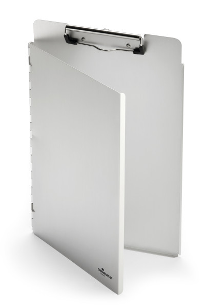 CLIPBOARD z szerokim klipsem, idealny na dokumenty w formacie A4. Z zamykaną klapką na dodatkowe luźne kartki. Z recyklingowanego aluminium pokrytego bezbarwnym lakierem .